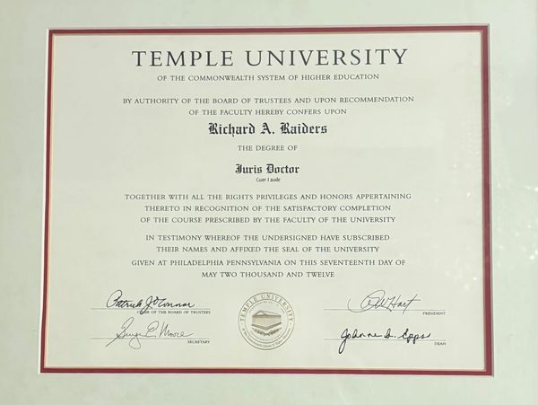 Juris Doctor cum laude, Temple University Beasley School of Law, Evening Division (2012)